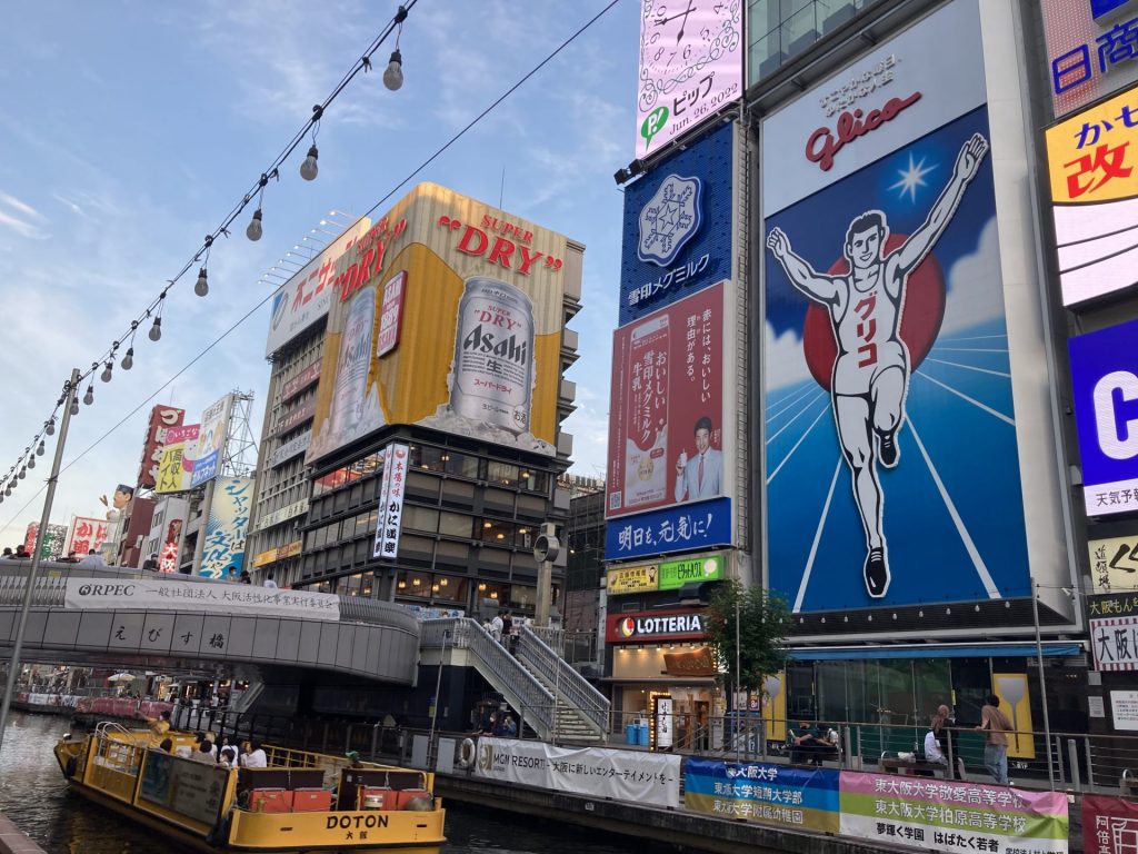 - 大阪の象徴とも言えるグリコの巨大看板や通天閣、巨大なカニのオブジェなどがある。